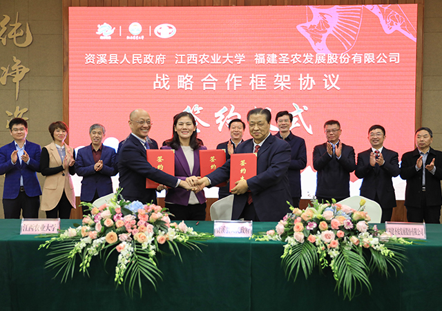 隨后,資溪縣政府、江西農(nóng)業(yè)大學、圣農(nóng)集團在資溪縣大覺山國際酒店簽訂戰(zhàn)略合作框架協(xié)議,三方將合力在資溪縣打造出圣農(nóng)集團第二個白羽肉雞育種基地。